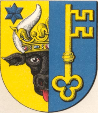 | Wappenbeschreibung nach Hupp | Stadt, 3274 Einwohner (1925) Wappen: Gespalten, vorn in Gold ein gekrönter halber schwarzer Stierkopf am Spalt, oben rechts begleitet von einem blauen Stern, hinten in Blau ein aufgerichteter goldener Schlüssel mit abgewendetem Bart. Weder das 1298 urkundliche dreieckige SIGILLVM CIVITATIS ROBELLE, noch das für 1389 nachgewiesene SECRETVM CIVITATIS ROBELLE zeigt die Spaltlinie, die Figuren stehen vielmehr frei nebeneinander im Schilde. Erst ein Siegel von 1707 bringt die Schildteilung, die dann stets beibehalten wurde. |